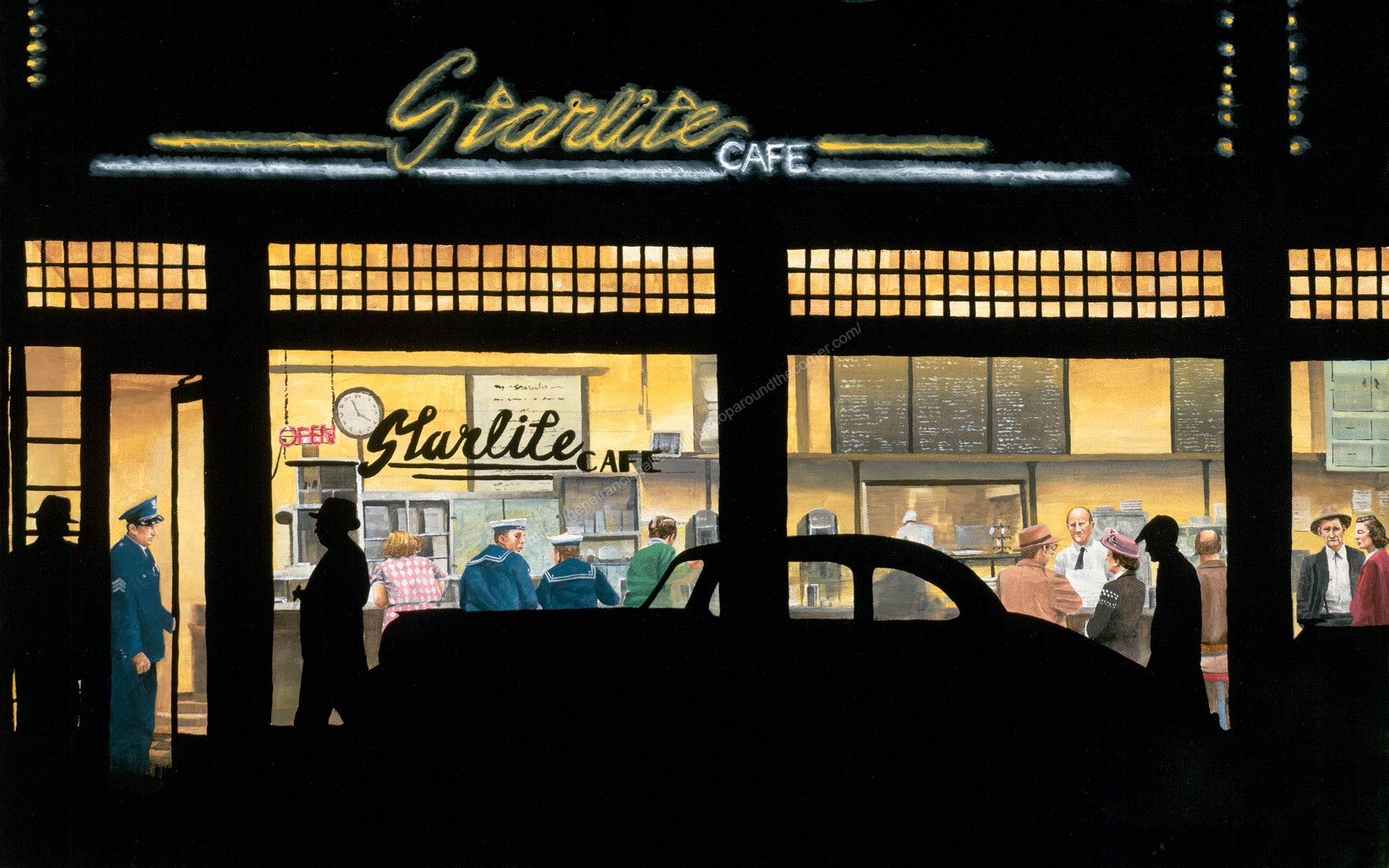 Experience the captivating ambiance of Midnight at the Starlite Cafe with this stunning Gene Francis painting. The expertly crafted brushstrokes and rich color palette bring the scene to life, making it a must-have piece for any art lover's collection. Immerse yourself in the magic of this unique and timeless work.